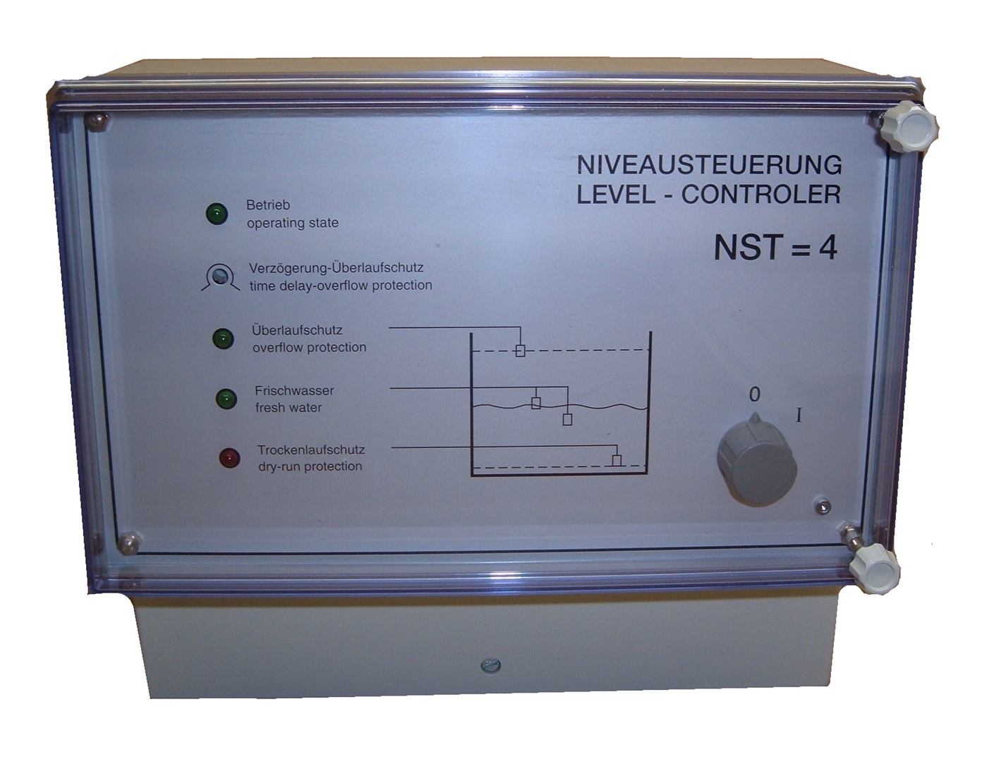 Niveausteuerung für Überlaufsammelbehälter mit Über- und Trockenlaufschutz, ohne Elektrode