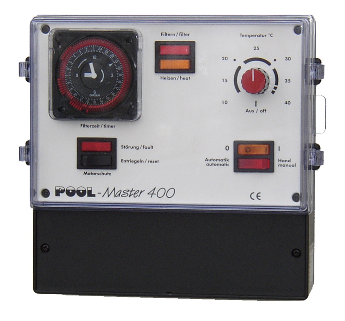 Zeitschaltkombination zur Steuerung der Filterzeiten und Regelung der Beckenwassertemperatur. Wahlweise für 230 V oder 400 V Filterpumpen nutzbar. Einstellbereich des elektronischen Motorschutzschalters 0-8 Ampere. inkl. Temperaturfühler mit 1,5 m Länge.