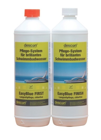 Das chlorfreie Langzeit-Wasserpflege-System EasyBlue FIRST & FINISH schützt zuverlässig vor Algen und Bakterien, im Freischwimmbecken als auch im Hallenschwimmbad.