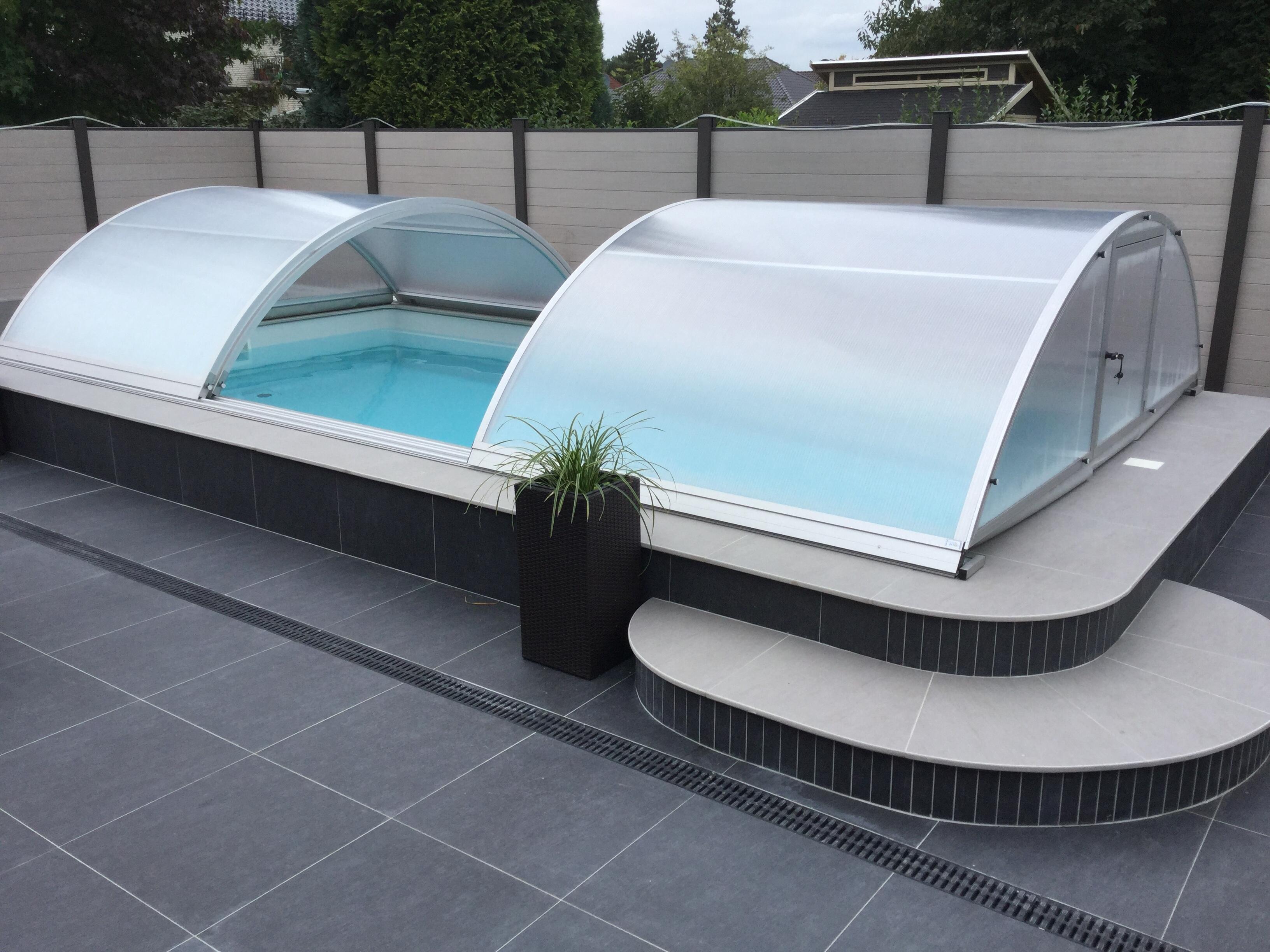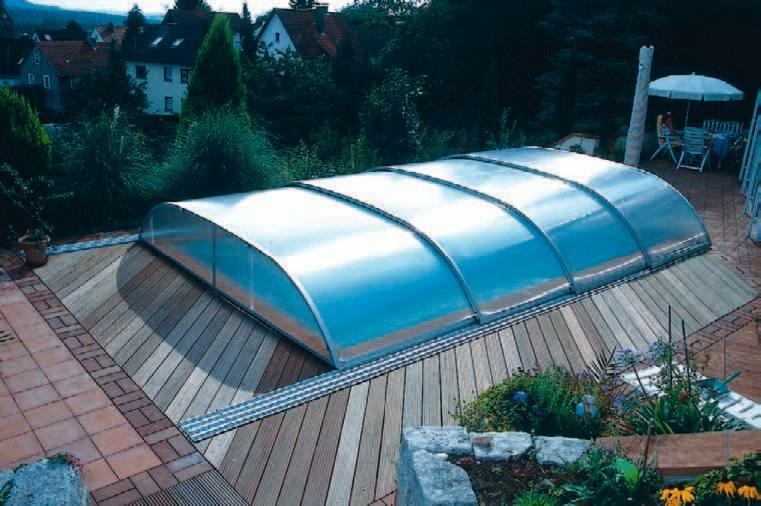 Verwandeln Sie Ihr Freibad in ein variables All-Wetter-Bad. Die Schiebeüberdachung Sun Roof kann komplett geöffnet werden oder – je nach Wind und Wetter – teilweise bis ganz geschlossen werden.