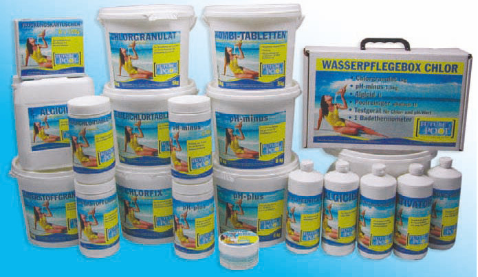 Komplettes Wasserpflegeset, bestehend aus 1 kg Chlorgranulat, 1,5 kg pH-Minus, 1 ltr. Algicid, 1 ltr. Poolreiniger alkalisch, 1 Chlor-pH-Testgerät und 1 Badethermometer.